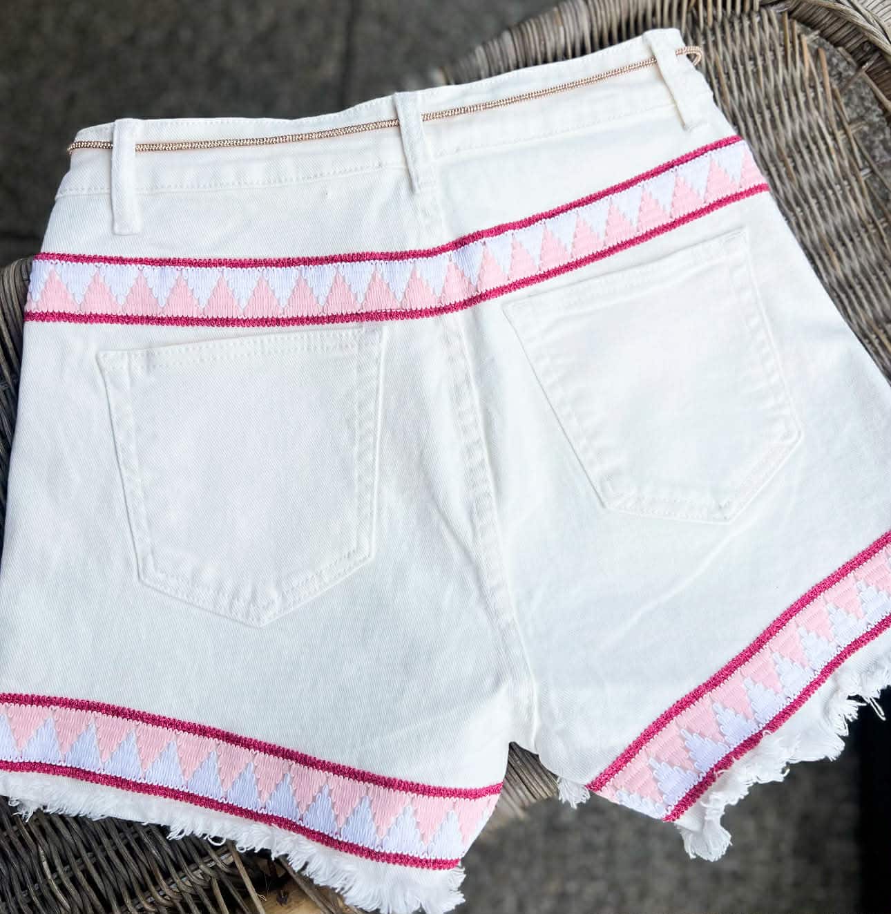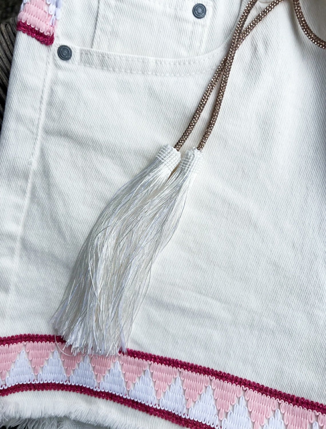 Nydelige detaljer som brodering og glitrebelte i livet med en dusk.