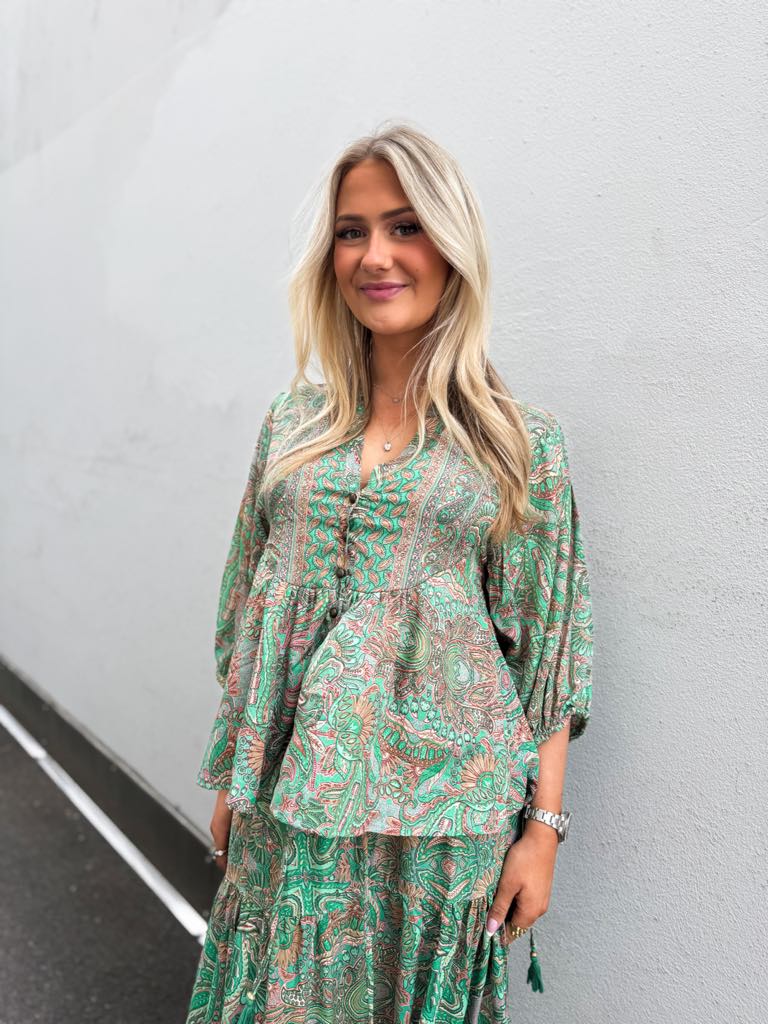 Nydelig bluse fra det danske merket Qnuz. Blusen har knepping i front, vie ermer med snøring nederst.