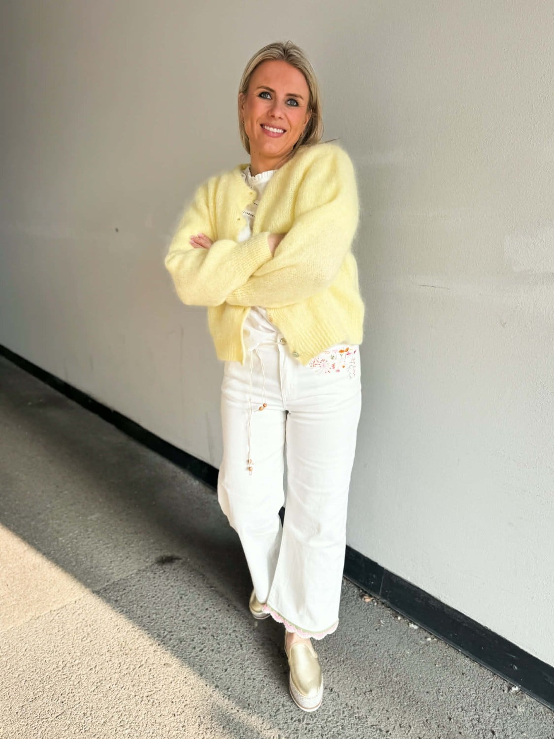 Buksen har sleng nederst med en brodert kant.