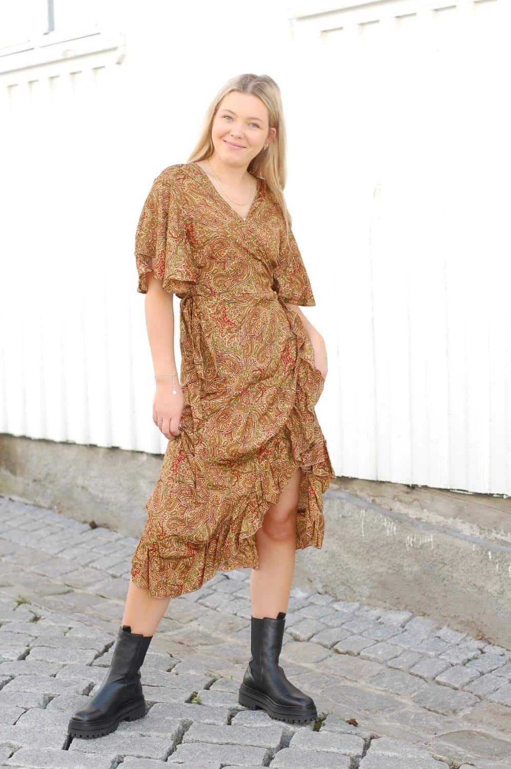 Alle er unik og har forskjellige print og farger. Dette er en wrap kjole- med knyting i livet, som kan strammes etter eget ønske.