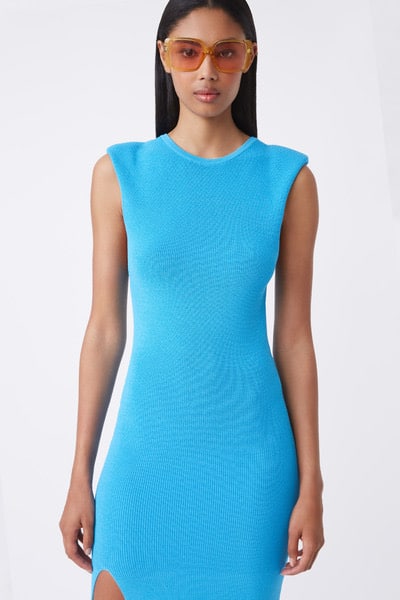Tettsittende kjole med splitt i siden og små puff ved skuldrene.