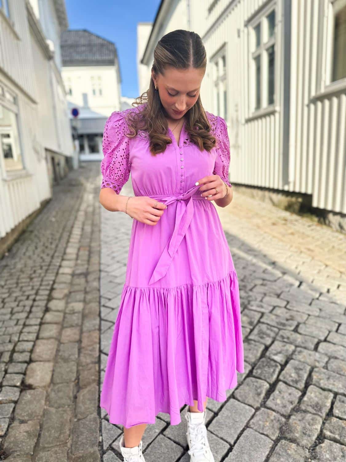 Nydelig farge med lekre broderingen på ermer og knyting i livet.